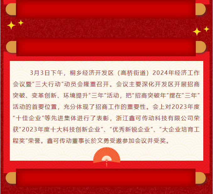 開(kāi)年即開(kāi)跑丨2024年經(jīng)濟(jì)工作會(huì)議暨“三大行動(dòng)”動(dòng)員會(huì)上鑫可獲多項(xiàng)榮譽(yù)表彰! 2024-03-08 19:23:52 浙江鑫可傳動(dòng)科技有限公司 瀏覽次數(shù) 1688 上一條致敬勞動(dòng)者 奮進(jìn)新征程 | 開(kāi)發(fā)區(qū)(高橋街道)領(lǐng)導(dǎo)率隊(duì)開(kāi)展“五一”節(jié)前走訪慰問(wèn)活動(dòng) 下一條各美其美·十二樂(lè)章丨活力高橋:扛起主平臺(tái)擔(dān)當(dāng),勇當(dāng)桐鄉(xiāng)招大引強(qiáng)排頭兵